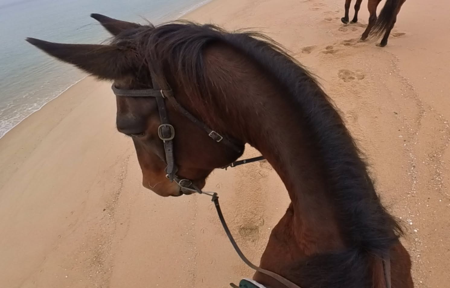 騎乗馬はクォーターホースのウギー、脚には反応するので鞭を入れる必要がなかったことに安堵した(以前、久住高原でのパティでそのズブさに難儀した)。スペシャルトレイルライド120分コースは前半は松林散策で後半はビーチライド、トータルで駈歩が2分半ほど、海岸駈歩は片道のみで物足りない印象はぬぐえない。深めの砂浜で馬への負荷に考慮の結果か。