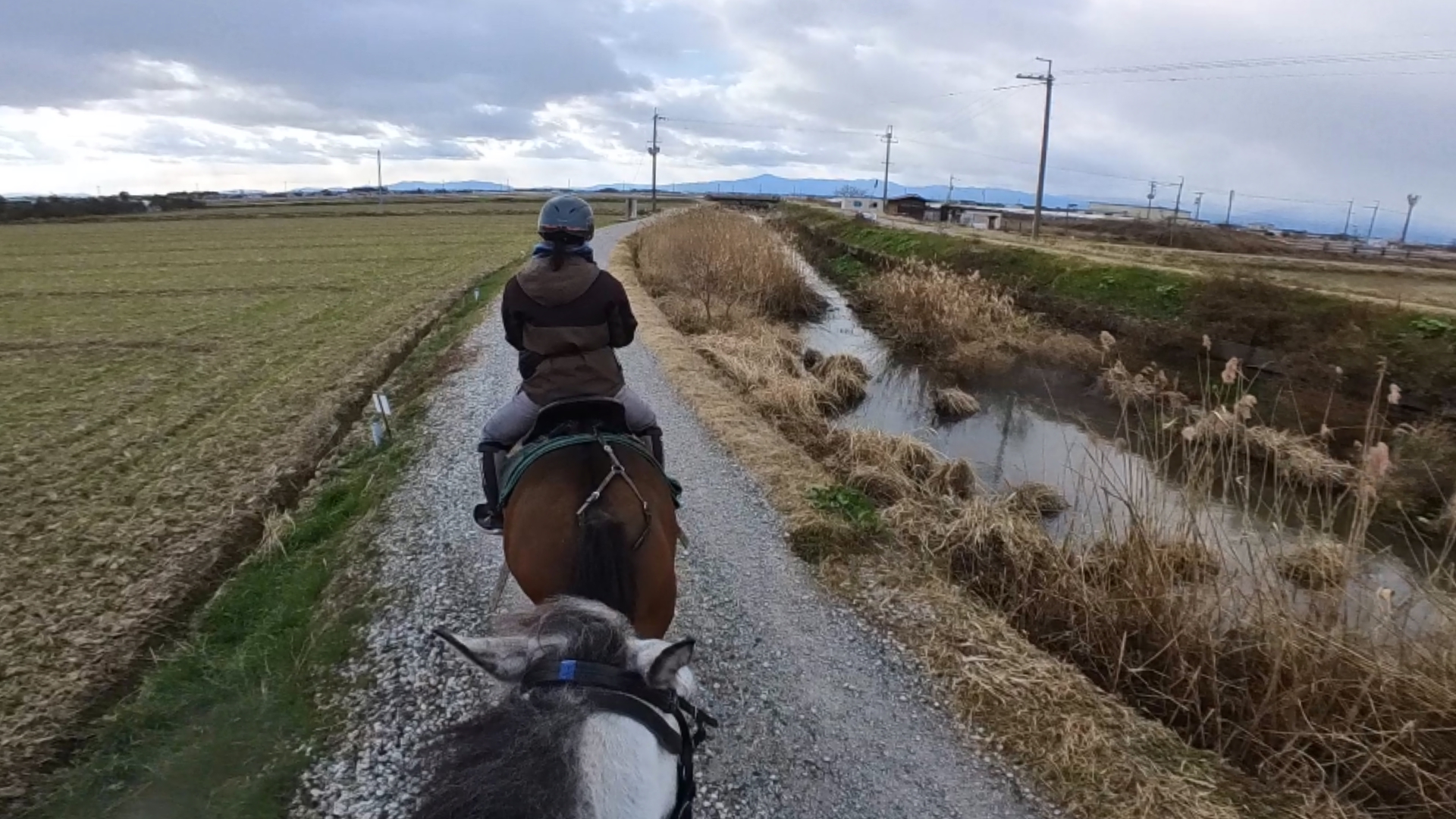 中盤からは、もうボロボロでめげってしまった。速歩はまだしも駈歩で暴れられると対応が困難ということもあり、帰路は最短で穏やかな経路をお願いしたが、常歩は少なく大半は速歩だった。