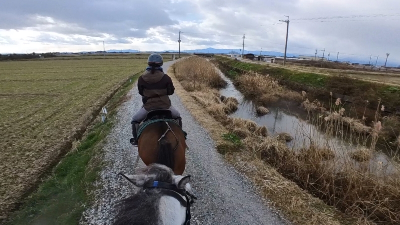 騎乗馬は前回同様、葦景(よしかげ)。前回は馬場では前進気勢をそれほど感じなかったが、今回は最初から感じた。馬場奥にある竹林での単独準備運動では注意深く慎重に進んでいくが、一旦外乗にでると、先導馬との距離をとるのが難しく手綱で抑えようとした結果、ハミを嫌がっているのが明らかであった。琵琶湖岸で駈歩する頃には、たびたび跳ねて暴れるようになり、乗り手も余裕がなくなりさらに手綱を短くかつ引っ張るものだから、状況は改善せず、磯部さんから脚を引いて尻を浮かせ手綱を片手持ちにし、もう一方の手で前橋を持って腰を押し付けるようにと注意を受けた。
