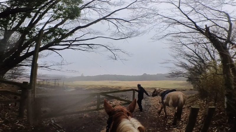 あいにくの小雨で残念ながら放牧地から桜島などの景色を楽しむことはできなかったが、馬上から間近で引退した乗用馬や競走馬などに会うことはできた。おっとりした牝馬パフィーに騎乗し、心地よい駈歩で広々としたいくつもの放牧地を駆け巡った。惜しむらくは常歩は前進気勢に欠けていることだ。ただ初級者であっても安全・安心に駈歩を交えたホーストレッキングが可能な乗馬施設だとは思う。