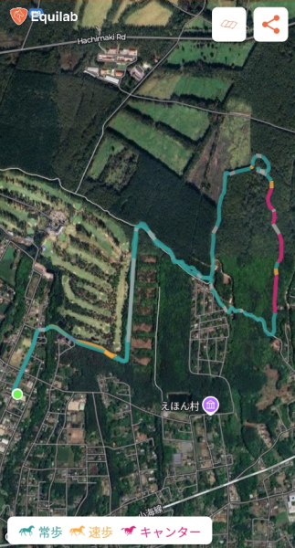 ・今回は女取湧水コース2時間外乗でしたが、途中石ころが多い坂道、防火帯の脇道など常歩でしか進めない区間もあり(Stravaの計測では距離8.41km、最高標高1188m、獲得標高231m)、速歩3分、駈歩3分ほど(Equilabの計測)でしたが、景色を十分楽しむことができました。なお、馬術競技場付近をめぐるコースでは鮮やかな紅葉が見られます。