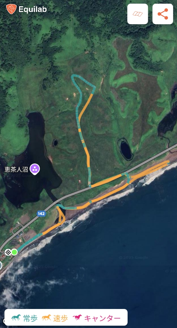 騎乗馬はエンデュランス競技を引退したトロッター種のドクター(全日本エンデュランス120kmで2位の実績)。外乗では過去二番目に前進気勢の強い馬で、先導馬を追い越さないように速歩の歩度を抑えるのに四苦八苦、この馬で歩度を詰めた駈歩は自分には難しそうなので海岸コースはほぼ速歩のみであった。