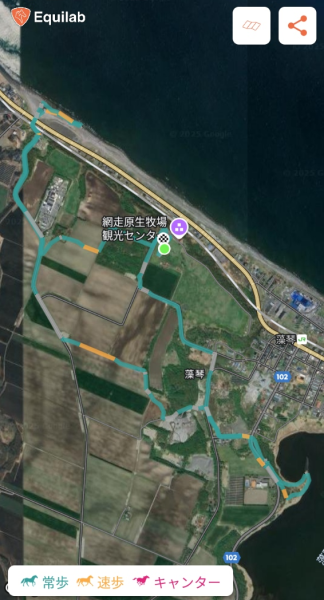 ・満喫コース2時間は、まず勇仁川から網走海岸に向かい、その後ワイルドな草木をかきわけながら藻琴湖で折り返す、全長8.5kmを5分程度の速歩と残りは常歩で走破する盛りだくさんで、経験者も楽しめるコースであった。なおガイドさんによると網走海岸は流氷接岸時期は壮観だとのこと。