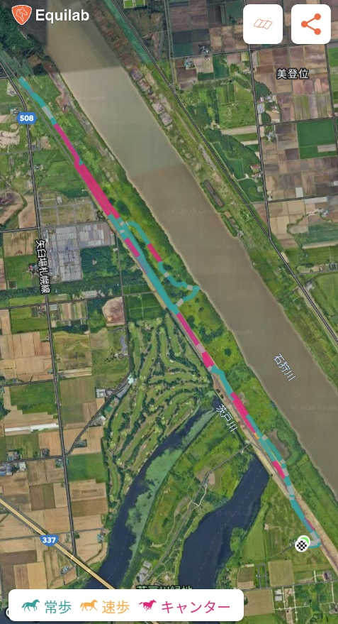 騎乗馬は初回同様、チップ。今回は道草許容が頭に入っているので常歩は基本、自由常歩で速歩と駈歩は手綱を張るようにした。駈歩も過去最長の12分以上で猫背はなかなか改善できないこともあり楽に乗ることを心掛けた。本来石狩湾あたりが終着点だと思われるが、道路上にはゲートが設けられ河川敷も立ち入りが制限されているようで、そこで引き返すこととなった。地図上で見ると海岸まで6kmほどあるようだ。帰りは先導馬と駈歩で並走したりして、貴重な経験をさせてもらった。