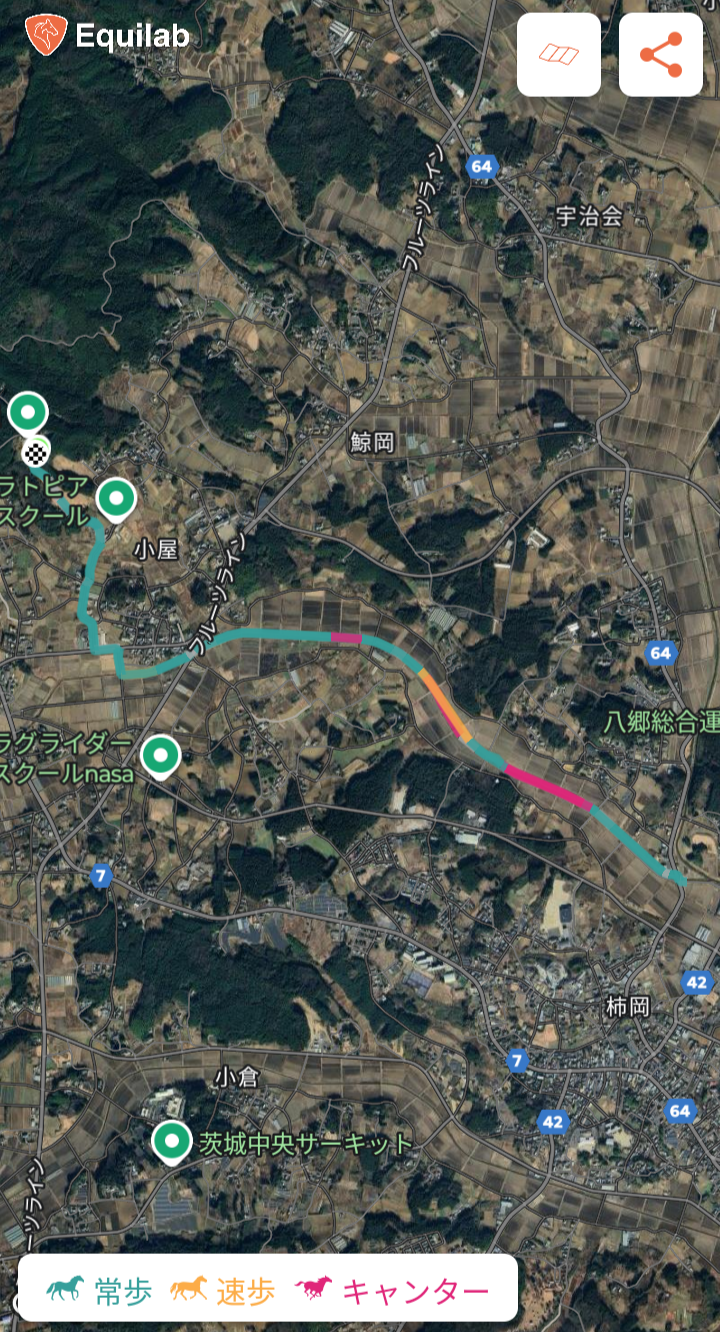 国内外乗12か所目。前日のサンシャインステーブルスさんでサクラに騎乗し常歩で前に出すことに苦労したので、ここではモンタかレイジーかの騎乗馬の選択で後者にし正解でした。21才にしては前進気勢が旺盛ですが、エクイラボ(デフォルト設定)の計測値で平均で21km/h、Max26km/h(先導バイクの瞬間Maxは35km/h)と乗りやすい駈歩でした。側対歩で軽速歩はとりづらいので2ポイント騎乗とすることで乗り切りました。